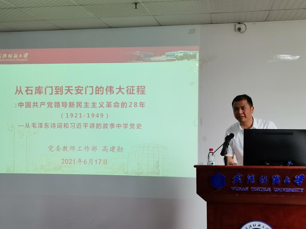 宣讲会上,高建勋部长以毛泽东、习近平等国家领导人关于党的历史的重要论述为切入点,围绕“从石库门到天安门的伟大征程:中国共产党领导新民主主义革命的28年”的主题,从“中国共产党的创立、党在大革命和土地革命战争时期、党在全民抗日战争和全国解放战争时期”三个方面进行了系统宣讲,并深刻阐释了在全党开展党史学习教育的重大意义、目标要求和主要任务。