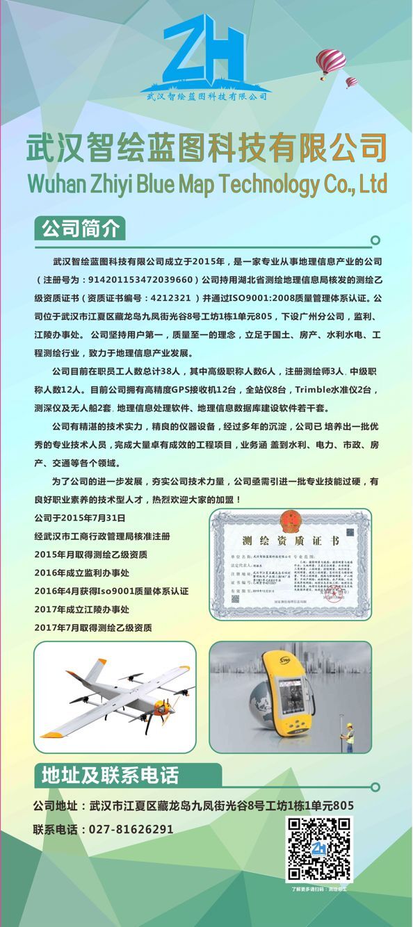 武汉智绘蓝图科技有限公司成立于2015年,是一家专业从事地理信息产业的公司(注册号为:914201153472039660)公司持用湖北省测绘地理信息局核发的测绘乙级资质证书(资质证书编号:4212321 )并通过ISO9001:2008质量管理体系认证。公司位于武汉市江夏区藏龙岛九凤街光谷8号工坊1栋1单元805,下设广州分公司,监利、江陵办事处。 公司坚持用户第一,质量至一的理念,立足于国土、房产、水利水电、工程测绘行业,致力于地理信息产业发展。