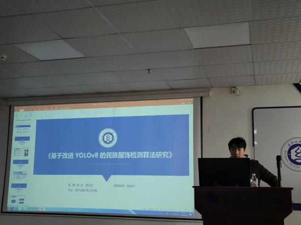 苏壮壮同学分享的主题是“Research on Ethnic Garment Detection Algorithm Based on lmproved YOLOv8”,主要围绕少数民族服饰识别展开。如今,少数民族服饰在现代化进程中面临逐渐消失的风险,如何借助科技手段实现高效、准确识别成为关键问题。基于这一现状,他提出基于改进 YOLOv8 模型的方法。他先是收集各民族服饰相关资料,制作新的目标检测数据集,同时引入 CSPPC 结构和 MSDA 机制优化模型,实现了模型的轻量化和检测精度的提升。实验结果表明,改进后的 YOLOv8 模型在准确率、召回率和 F1 值上均优于基准 YOLOv8 模型,在参数量和精确率上也超过 YOLOv11 模型,能有效进行少数民族服饰图像分类,为民族服饰的信息化处理和文化传承保护提供有力支持。