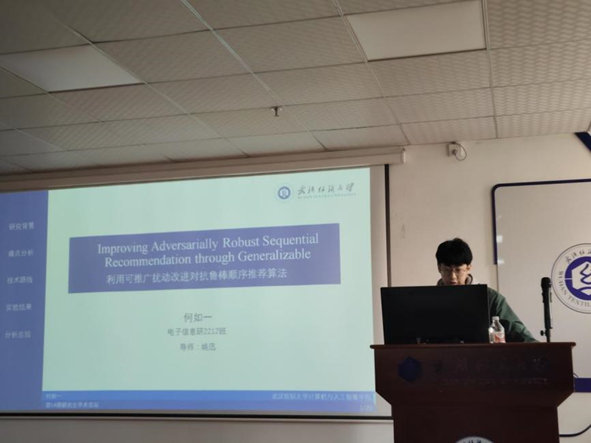 何如一同学分享的主题是 “Improving Adversarially Robust Sequential Recommendation through Generalizable Perturbations”,重点研究序列推荐模型的防御算法。现有的序列推荐模型易受各种攻击影响,且现有的对抗性防御算法存在误差传播、泛化性难保持和噪声特征等问题。他针对这些问题,提出创新的防御算法。该算法利用基于多层感知机的扰动生成模块创建对抗性样本,无需梯度估计;将生成模块与编码器映射模块结合,使模型更好应对数据微小变动;还把级联信息过滤融合扩散模型连接至信息瓶颈层,逐步去除非鲁棒性项目和特征,并提升模型泛化能力和鲁棒性。