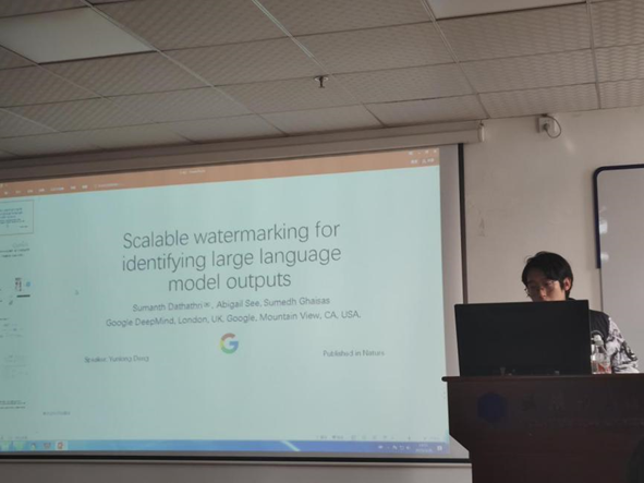 邓云龙同学分享的主题是 “Scalable watermarking for identifying large language model outputs”,他介绍了一种新的水印方法。SynthID - Text 是一种可用于生产的水印方法,适用于大型语言模型(LLM)生成的文本。该方法在生成过程中微妙改变文本,能在不影响文本质量和LLM 性能的情况下高效检测合成内容。与其他方法不同,SynthID - Text 检测时无需访问原始 LLM,还能与推测性采样等现有生产技术无缝集成,支持大规模部署。经过广泛测试,包括近 2000 万条 Gemini 响应的实时实验,证实了上述方法的有效性以及对质量的最低影响,这项技术旨在通过识别合成文本并减轻潜在误用,促进负责任的LLM使用。