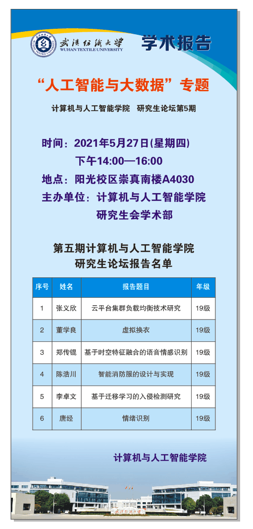 在这次的“人工智能与大数据”专题中,六位同学分别从模型中融入注意力机制对其进行改进的机理、几种模态分解与时间序列模型相结合(如EMD-TCN,EEMD-TCN等)后在云平台集群负载预测中的应用、步态识别情感领域中的不足、智能消防服的柔性传感单元制备方法、网络安全的重要性研究路线、迁移学习解决了语音数据难以获取和跨语料库识别问题这些方面介绍和分享了自己研究的相关工作。同学们积极提问,认真讨论交流学习。