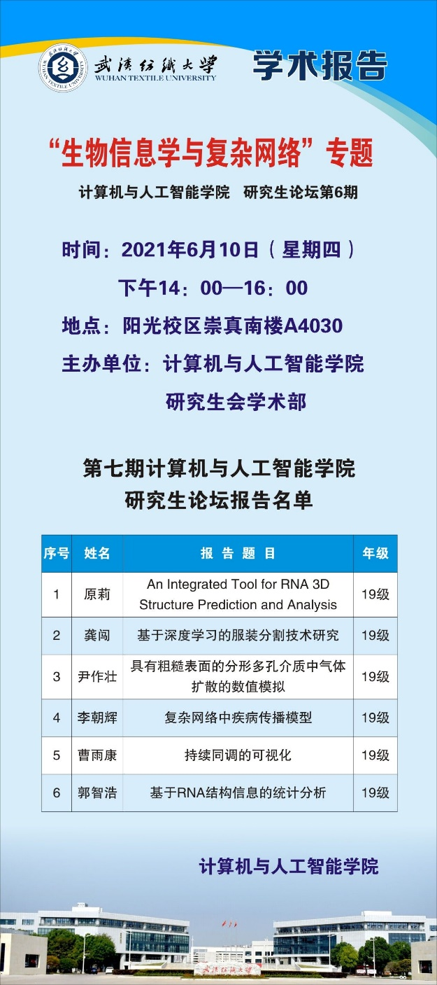 在这次的“生物信息学与复杂网络”专题中,六位同学分别从RNA三级结构预测和二级三级结构信息统计、复杂网络中常见的疾病传播模型:SI,SIS,SIR,SEIR等、多孔介质管束模型相关理论、服装分割领域的Deeplab v3+模型、持续同调这些方面介绍和分享了自己研究的相关工作。同学们积极提问,认真讨论交流学习。