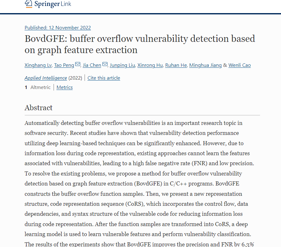 11月12日,《Applied intelligence》(中科院SCI二区期刊,影响因子为5.019)在线发表了我校ok138cn太阳集团529边缘计算与信息安全团队的最新成果“BovdGFE: Buffer Overflow Vulnerability Detection Based on Graph Feature Extraction”,论文由ok138cn太阳集团529彭涛教授指导,2020级研究生吕星航等同学完成。