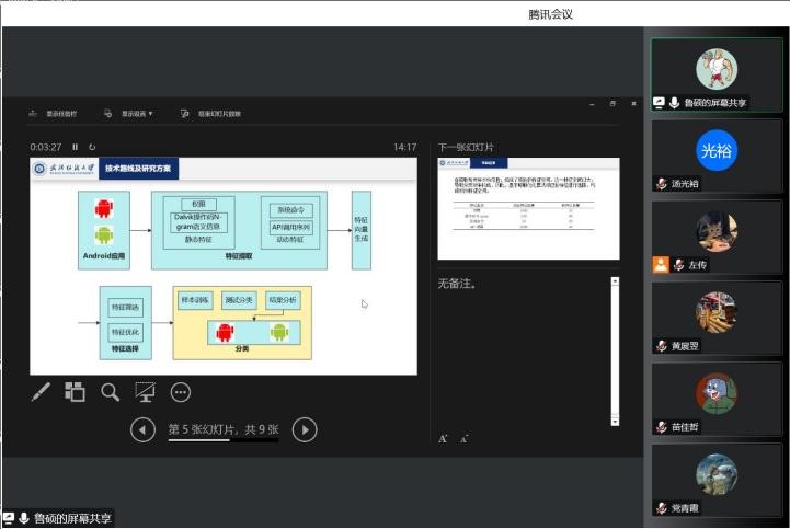 鲁硕的报告题目是“基于深度学习的安卓恶意应用检测”,报告指出安卓恶意应用程序的检测目前存在着检测速度慢、检测率低等问题,因此为解决此类问题他提出了一种基于深度神经网络的Android恶意软件检测方法。该方法从Android恶意应用的恶意行为特点出发,运用静态分析和动态分析相结合的方法,在全面提取Android应用的Dalvik操作码、N-gram语义信息、敏感权限、函数API调用序列、系统命令的基础上,对提取的特征进行向量化。之后基于蜉蝣优化算法对特征进行有效的选择以降低维度,并使用深度神经网络对恶意软件进行分类检测。