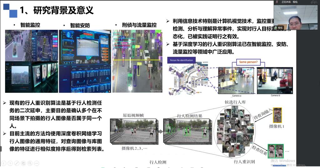 跨视角目标(如行人、车辆等)重识别在智慧城市、智慧社区等领域有重要应用,多模态行人重识别旨在探索不同异构数据间的行人检索问题,该任务可以有效弥补常规基于可见光图像行人重识别技术在复杂场景下的不足。程旭教授详细介绍了可见光-红外图像跨模态行人重识别的研究现状、存在的难题以及课题组在该领域的研究成果。