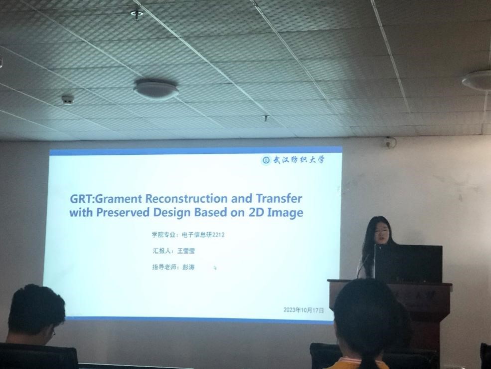 王莹莹同学分享主题是“Grament Reconstruction and Transfer with Preserved Design Based on 2D Image”,虽然深度学习的3D人体重建技术在动画和游戏等行业有广泛的应用,但从单个图像中重建的着装人体大多无法将人体与服装分离。所以她提出了一种服装重建和转移框架(GRT):将参数化服装模板契合到人体隐式场中以重建服装,并通过法向量恢复表面细节。为了将重建的服装转移到拥有不同拓扑结构和身体形状的人体,与现有的基于目标身体形状拟合的服装方法不同,她提出了SPC(结构保持约束)策略,通过在服装拉普拉斯网格转换过程中固定关键点和限制局部边缘长度、角度和法向量的变化,在服装的变形过程中添加形状保持和结构约束,这限制了服装网格的拉伸和扭曲极限,以确保服装在变形过程中保持结构稳定。经过实验证明,她的服装重建方法在细节方面取得了进展,原始设计的服装在服装转移过程中得以保留。
