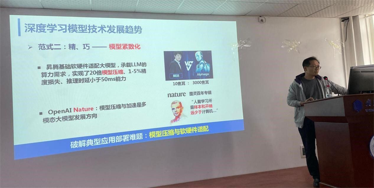 围绕《深度神经网络低比特量化技术》,张宝昌教授首先分析了深度学习在解决实际问题中出现的瓶颈问题,如模型参数量大、功耗大、端侧设备上的部署应用难等。为了解决相关问题,他提出一系列二值卷积网络构建方法,构建了基于调制网络结构的二值网络模型,并引入贝叶斯学习、协同梯度下降算法等方法,实现了二值网络模型在目标检测任务上的无损压缩。Transformer是人工智能领域的里程碑方法,为了解决其在实际端侧部署难题,他提出了Q-VIT、Q-DETR以及在底层视觉任务上的量化方案,实现了4-比特目标检测与识别任务上的无损压缩。在应用方面,该方案搭建了智能相机,实现了矿山、工业检测等领域应用。
