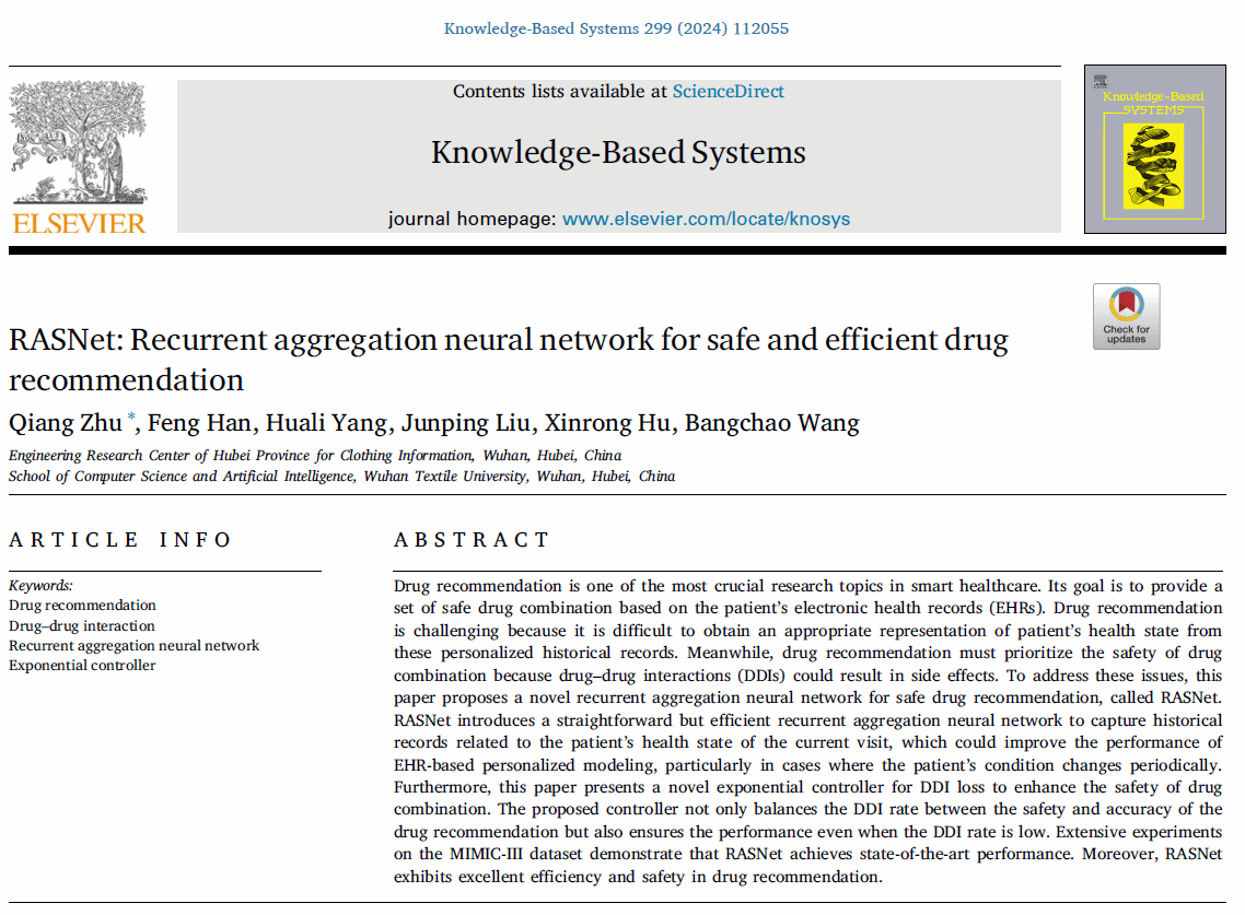 工作二:Safe drug recommendation through forward data imputation and recurrent residual neural network发表在期刊《Applied Soft Computing》。由于医疗文本广泛存在数据缺失问题,使得患者的健康状态画像不准确,从而导致患者安全用药存在隐患,该研究工作提出了一种前向数据填充方法,以通过引入药物-药物相互作用领域知识图谱确保推荐药物组合的安全性。