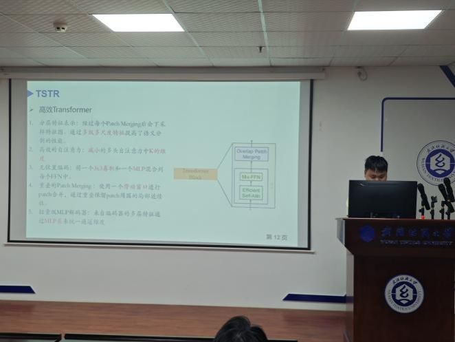 赵国强同学分享的主题为“TSTR: A Real-Time RGB-Thermal Semantic Segmentation Model with Multimodal Fusion Transformers”。传统语义分割方法主要依赖于单模态RGB图像,只有在白天良好的照明条件下才能表现良好,而在夜间等具有挑战性的照明条件下表现不佳。最近的研究已经开始将热像仪生成的热图像作为一种额外的模式集成到深度神经网络中,称为RGB-T语义分割。然而,现有的方法受到CNNs有限感受野限制,往往依赖于复杂的融合模块来提高精度,忽略了模型的计算时间。为了解决这些问题,他们提出了一种实时多模态融合网络(TSTR)用于RGB-T语义分割。具体而言,利用Transformer的全局自注意力机制和远程依赖建模,设计了一种基于Transformer的双分支编码器,分别提取RGB和热特征。为了确保实时性能,他们引入了更有效的自注意力块,并采用轻量级MLP解码器来聚合来自不同级别的信息以进行密集预测。此外,他们采用简单的加性融合操作进行多模态特征融合。大量的定量和定性实验表明,他们方法的分割速度明显快于现有的网络,同时获得了更好的分割精度。