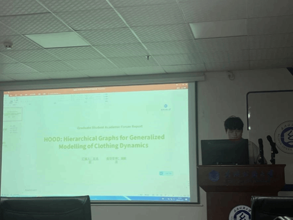 彭志宏同学分享的主题为“HOOD: Hierarchical Graphs for Generalized Modelling of Clothing Dynamics”。 HOOD 研究了一种通用的服装动态建模方法,利用图神经网络和多层消息传递,实现对紧身和宽松服装的实时预测。通过分层消息传递方案,有效传播刚性拉伸模式,同时保留局部细节。实验结果表明,HOOD 在定量上优于强基线方法,其结果被认为比最先进的方法更逼真。此外,该方法在处理复杂服装动态时表现出色,能够生成高质量的模拟效果,为虚拟试衣和动画制作提供了新的可能性。
