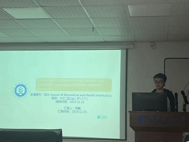 周畅同学分享的主题为“Enhancing Drug Repositioning through Local Interactive Learning with Bilinear Attention Networks”。 药物重新定位是一种识别现有药物新治疗应用的有效策略。在本研究中,他们提出了DRGBCN,一种整合异构信息的深度学习模型,通过图卷积网络和双线性注意机制捕捉药物与疾病的复杂交互关系。模型通过十折交叉验证在三个公开数据集上获得了平均0.9399的AUROC,并在膀胱癌和急性淋巴细胞白血病的案例研究中展现了实际应用潜力。此外,药物-疾病网络分析揭示了社区内相似药物的成功聚类,为药物-疾病相互作用提供了新的见解。