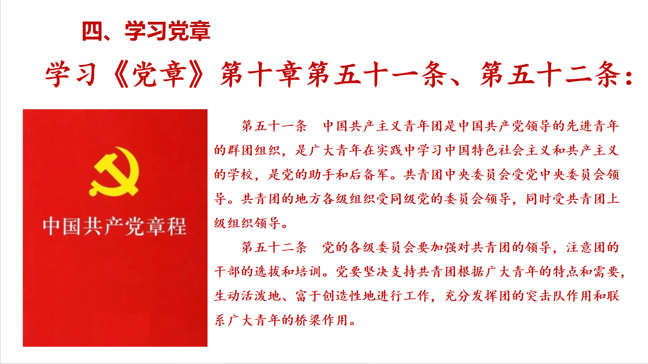 会议伊始,全体党员齐唱国歌并重温入党誓词。党员们认真学习了《中国共产党章程》第十章第五十一条、第五十二条,明确了共青团与党的紧密联系,以及党对共青团工作的重视与支持。