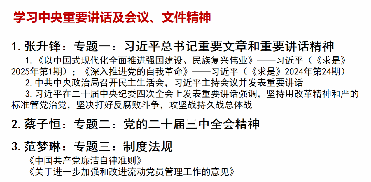 会上,张升锋带领大家学习习近平总书记重要文章和讲话精神,引导党员深刻领会党的战略布局与自我革命要求。蔡子恒对党的二十届三中全会精神进行解读,分析了新时代全面深化改革的重大成就,带领党员们深入理解了全会精神内涵,更加清晰地认识到当前时代发展的趋势与要求。范梦琳则聚焦制度法规,深入讲解《中国共产党廉洁自律准则》和《关于进一步加强和改进流动党员管理工作的意见》的制度准则,强化党员纪律意识。