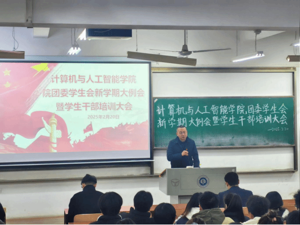 院党委书记晏伟就新学期、新气象、新奋进主题进行总结讲话。他通过deepseek、春晚跳舞机器人等例子,强调了学生干部应带领广大学生群体把握时代气息,跟上时代节奏,希望院团委各个部门形成“兄弟连”,团结一心。同时,他要求学生干部不仅要关注表面“加分”,也要注重于内核能力“加分”,要为自己内在收获进行评估。其次,他对学生干部开展工作提出了几项要求,认为学生干部应及时用“会议”解决问题,积极地带动学生进行各种活动,加入社团,要充分发挥兴趣的驱动力,丰富学生的大学生活,培养学生的爱好与积极性。