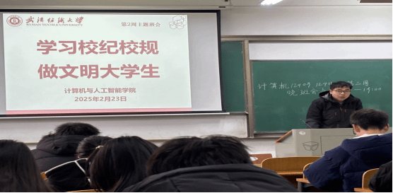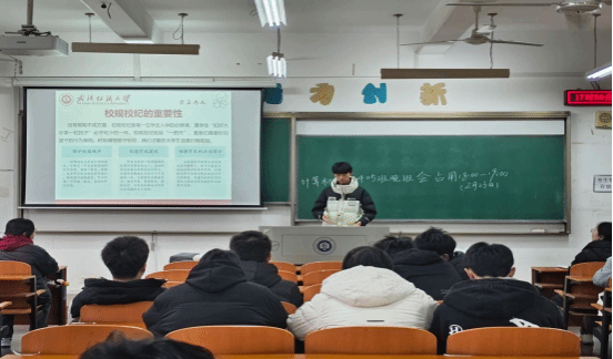 班会开始,辅导员以“没有规矩不成方圆”为引,着重阐述校规校纪对大学生的重要性,强调其作为行为准则,在营造和谐校园、培养法治意识方面的关键作用,关乎学生成长发展,引发了学生们对校规校纪学习的浓厚兴趣。