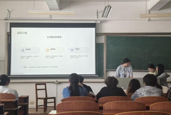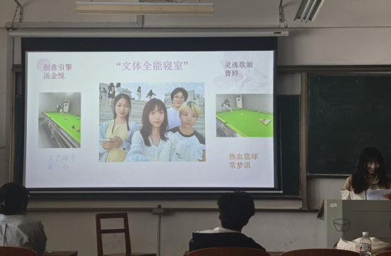 王一冰同学作为寝室代表对寝室的成员进行了详细介绍,他给我们展示了四个各自生怀“绝技”的室友,幽默诙谐的ppt带动了现场氛围。