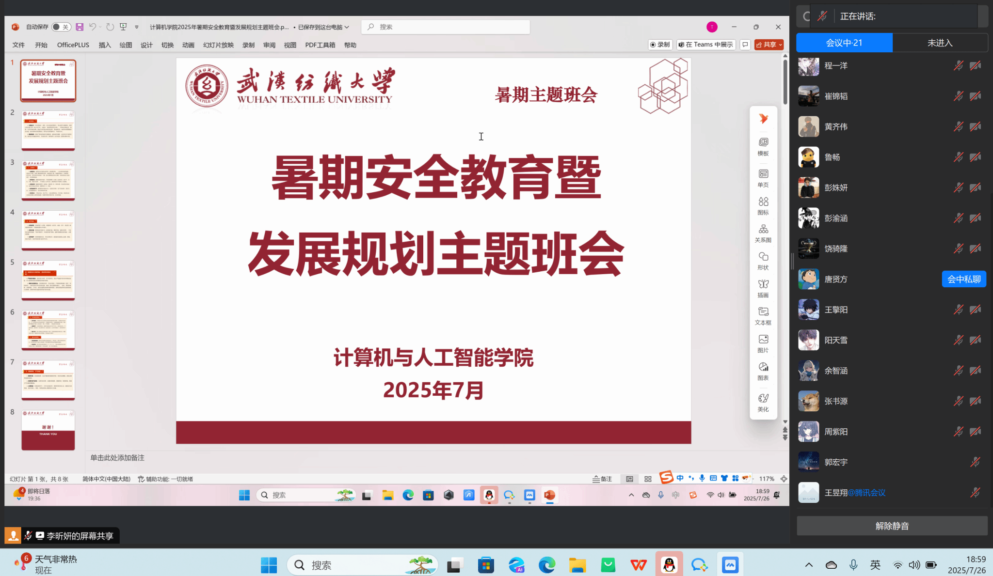 此次线上主题班会分工明确、重点突出,既强化了学生的安全防范意识,又为暑期专业提升指明方向,助力学生在假期实现安全与成长“双丰收”。学院将持续跟进学生暑期动态,全力守护学生暑期安全,筑牢校园安全防线。
