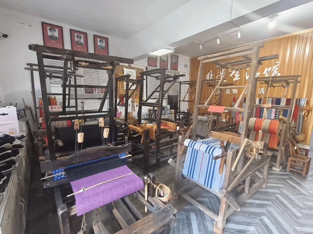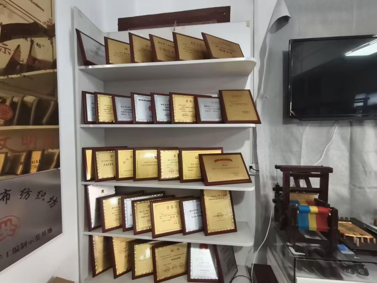 随后,实践团前往红安县非物质文化遗产保护传承基地,作为大布传统纺织技艺非遗工坊与红安福锦织绣文化传播公司所在地,陈列架摆满的荣誉证书见证红安纺织非遗传承的辉煌成就。静静伫立古老的织布机,默默讲述纺织工艺悠久历史。队员们通过与工作人员交流,详细深入了解纺织工艺流程,调研非遗工坊运营状况,探究红色文旅对本地纺织产业的带动效应。