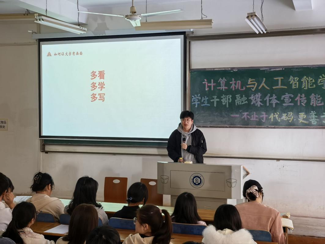 在新闻稿撰写环节,新媒体部门分管主席孙艺文同学通过典型案例对比,明确了优秀新闻稿应具备“信息准确、语言规范、结构清晰”三大要素,并重点讲解了标题提炼、语言书面化、图文排版等关键技巧。她提醒同学们,在借助工具辅助写作的同时,更要注重人工复核,确保内容严谨无误。
