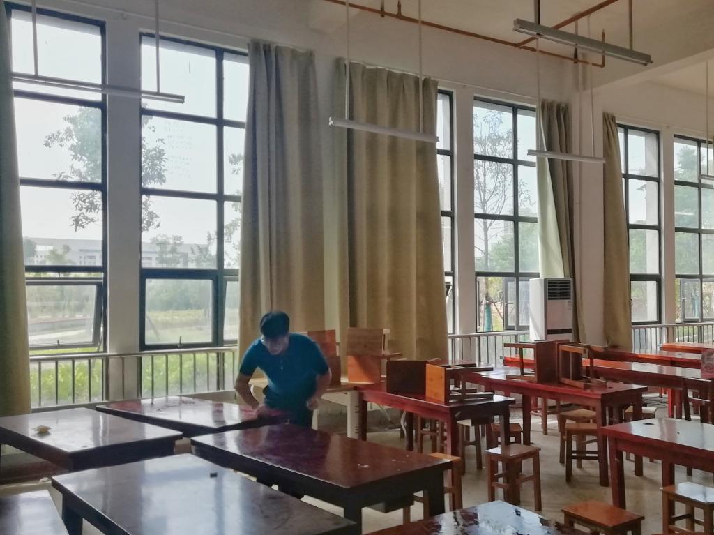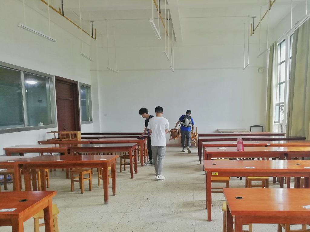 廖龙带领队员们对教室原有杂物进行了清理,将检查完好的桌椅按照新的要求做了布置,针对桌面以及地面的污垢灰尘也做了细致的清洁。整理过程中,队员们积极协助廖龙进行教室的清洁工作,工作态度认真、没有怨言,以行动展现自身无私的志愿者精神。经过一下午的清洁,教室以崭新的面貌等待迎接考研学子们。