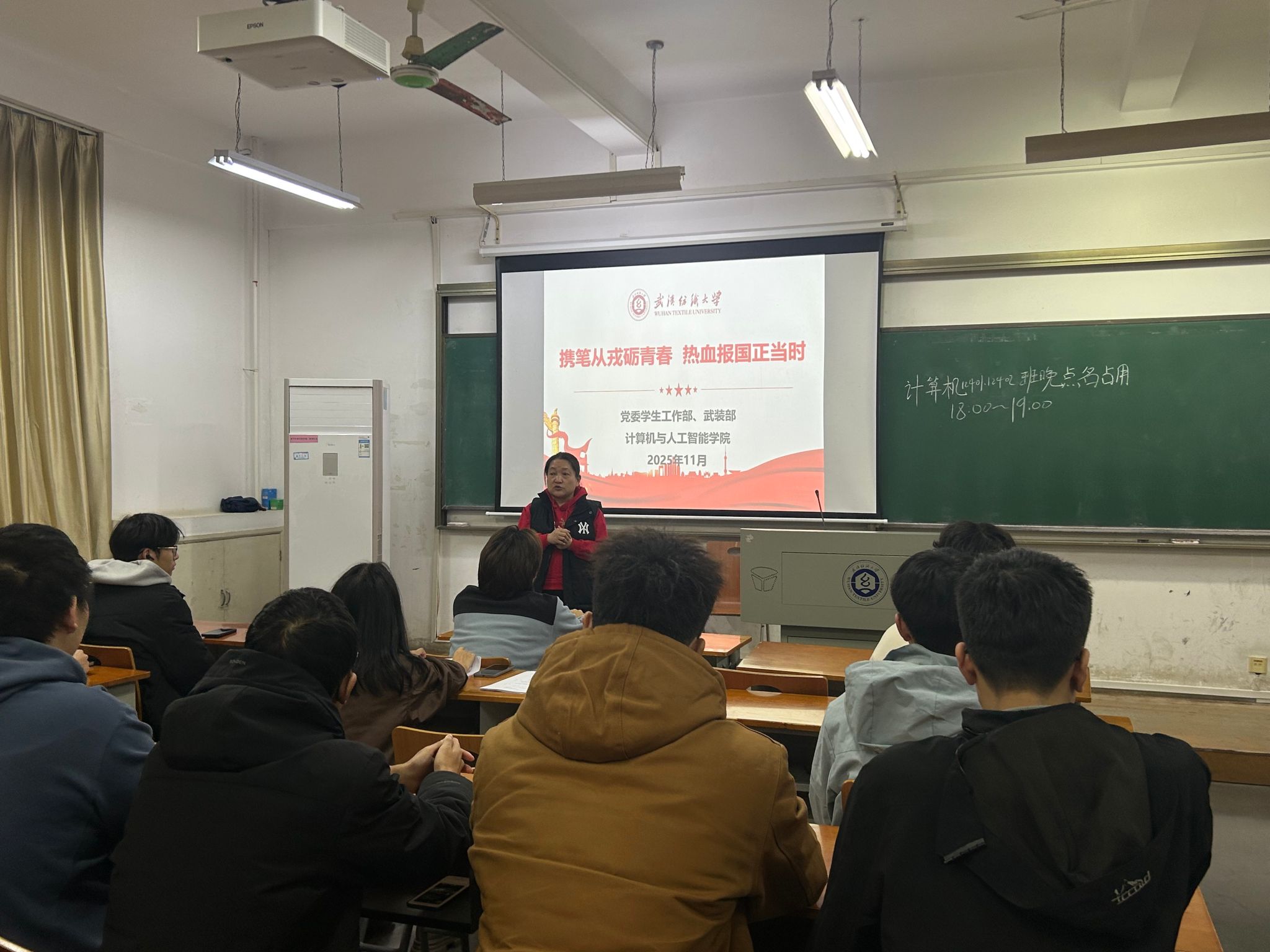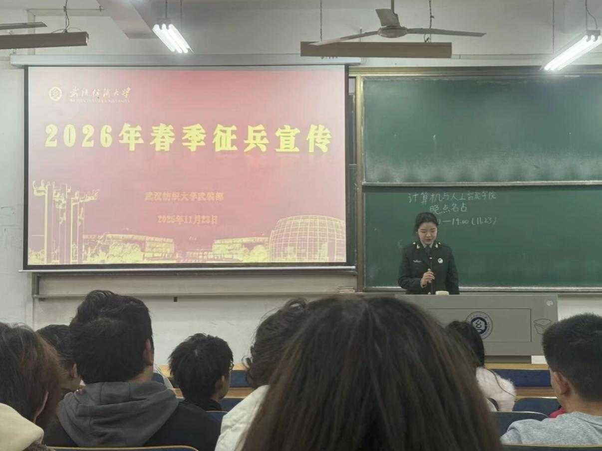 随后,各班简要介绍征兵政策后,退役士兵李若欣身着军装登台宣讲军旅生活。她以“青春献军营,科技助强军”为主题,结合自身服役经历,讲述在战略支援部队的两年时光。投影屏幕上,一组组鲜活的图片映入眼帘:李若欣身着迷彩服在发射站下的英姿、与战友执行通信保任务的专注神情。现场播放《ok138cn太阳集团2026年征兵宣传视频》,通过校园与军营的场景切换,展现“携笔从戎”的双重价值。最后,退役士兵李若欣现场解答同学关于军旅生活的问题,并发出“青春算法,强国有我”倡议,号召全体同学将个人成长融入国家战略,以热血点燃报国理想。