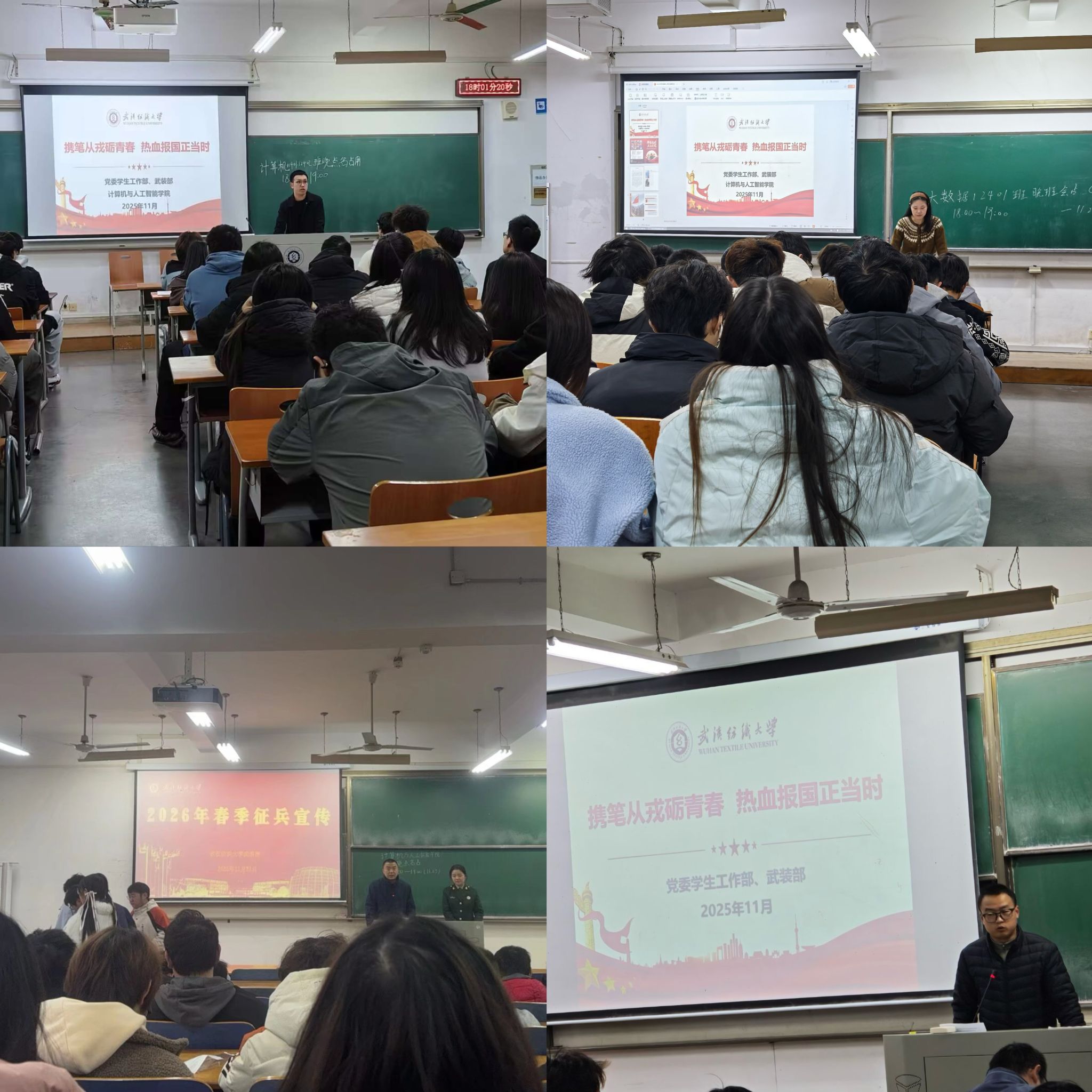 11月23日,ok138cn太阳集团529开展“携笔从戎砺青春 热血报国正当时”征兵宣传主题班会暨征兵宣传“三个一”活动。本次班会特别邀请退役士兵分享军旅生活,并通过宣传视频、图片展示等形式,全方位展示军旅风貌,激发了学子参军热情。