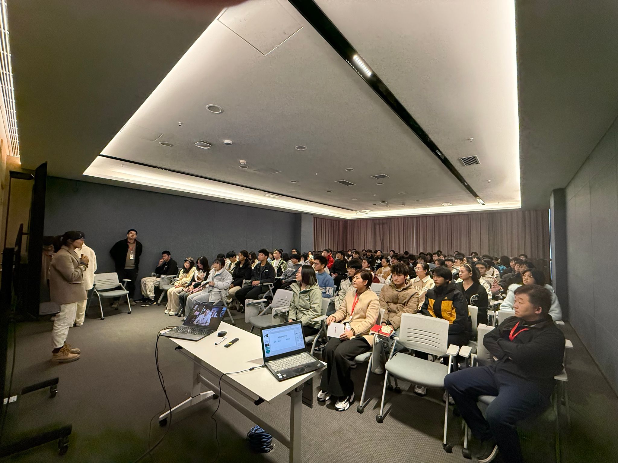 在光庭公司工作人员的引导和讲解下,同学们依次参观了公司的智能座舱展厅、研发中心及测试实验室。展厅内,集成了前沿人工智能与软件技术的智能座舱产品,实现了人、车、路的深度互联与场景化服务,让同学们沉浸式体验了“软件定义汽车”的未来图景。研发中心内,严谨有序的工作氛围和工程师们专注的神情,让同学们对未来的职业环境有了初步的认知。