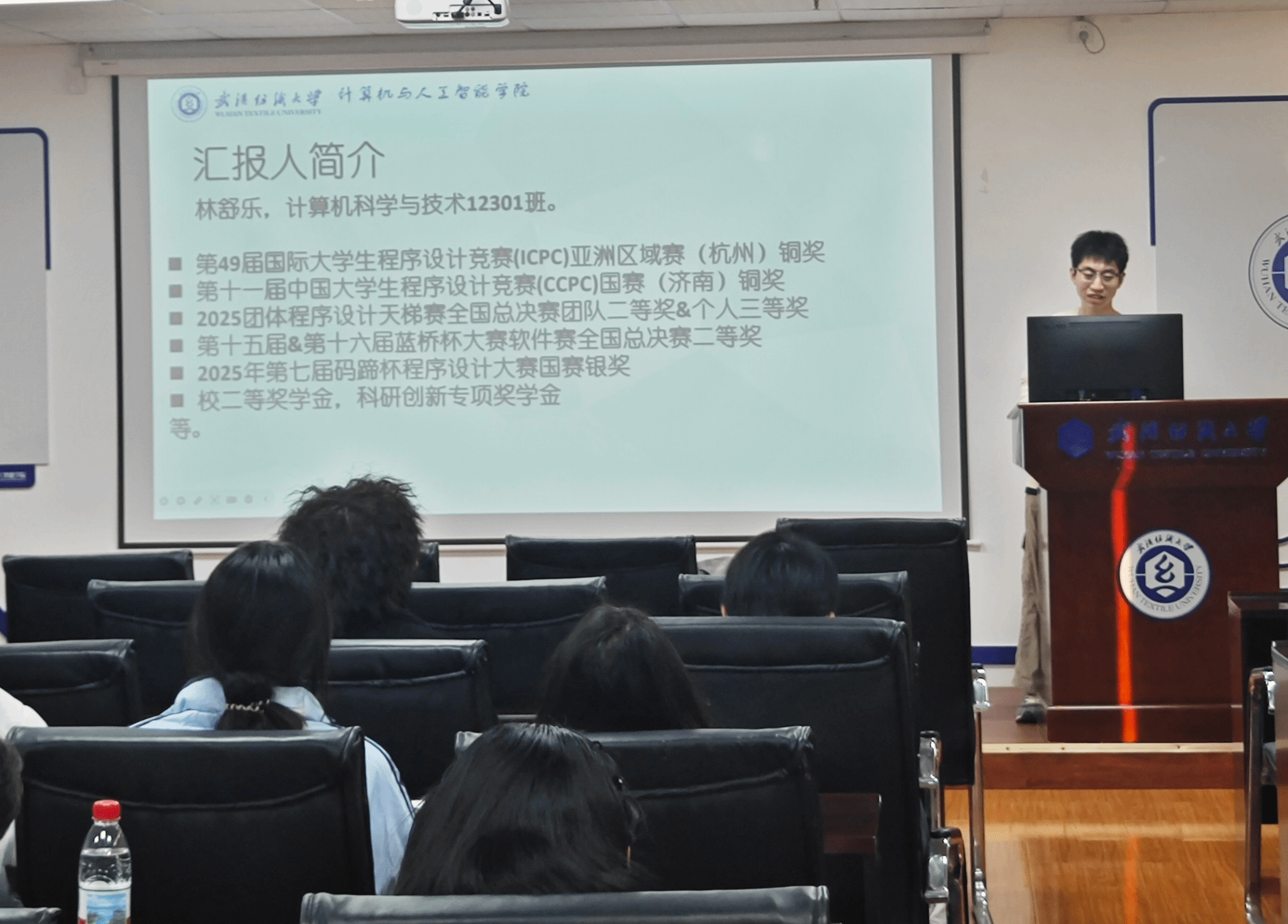 随后,ICPC亚洲区域赛及CCPC国赛铜奖得主、计算机科学与技术12301班的林舒乐同学,以冷静缜密的逻辑为同学们带来了一场硬核分享。林舒乐不仅详细剖析了从国内蓝桥杯、天梯赛到国际ICPC赛事的不同赛制特点与考察侧重,更无私分享了自己像打排位赛一样训练的现代备赛技巧,展示了如何利用大模型工具进行智能Debug和辅助训练。除此之外,他跳出单纯的技术视角,为同学们详细规划了算法竞赛在“大厂就业”、“保研名校”等不同人生路径中的核心竞争力,帮助大家厘清了投入产出比,不仅教大家“怎么学”,更帮大家想清楚“为什么学”。