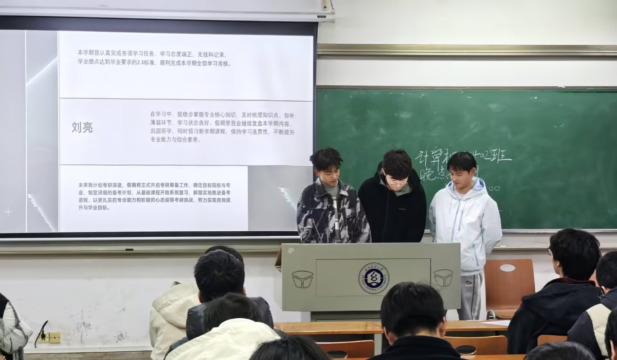 大二上半学年落下帷幕,计算机12402班迎来新发展阶段。为进一步增强集体凝聚力,推动学业提升,更早明确备考方向方向,规划毕业蓝图,近日,我班在崇志楼举行2025-2026学年春季学期小结班会。本次班会由班长卻昌辉主持,辅导员李港全程指导,采用"宿舍汇报制",全班10个宿舍依次登台分享,分享成长的点滴与未来的愿景。
