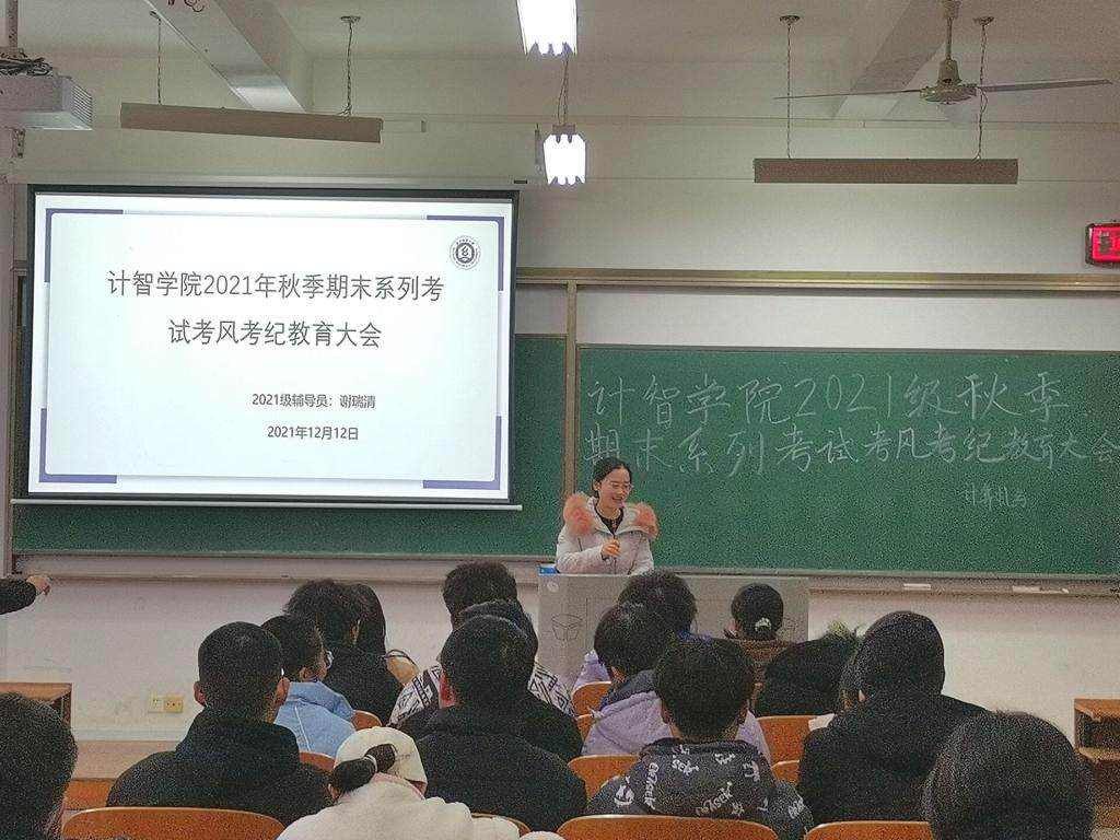 伟大人格,重要的是一个“诚”字。期末考试将近,为端正考风,严肃考纪,营造文明、诚信考试的良好氛围,同时也为了提高同学们的道德修养和思想素质,并让同学们进一步了解违反考试纪律及考试作弊的相关规定。计算机学院于12月12日下午14:00在崇志楼307室召开了2021年秋季期末系列考试考风考纪教育大会。