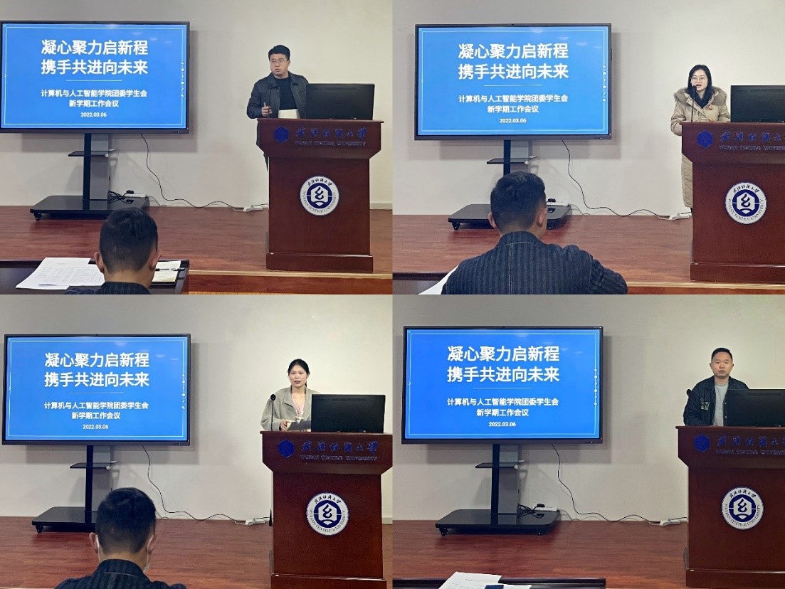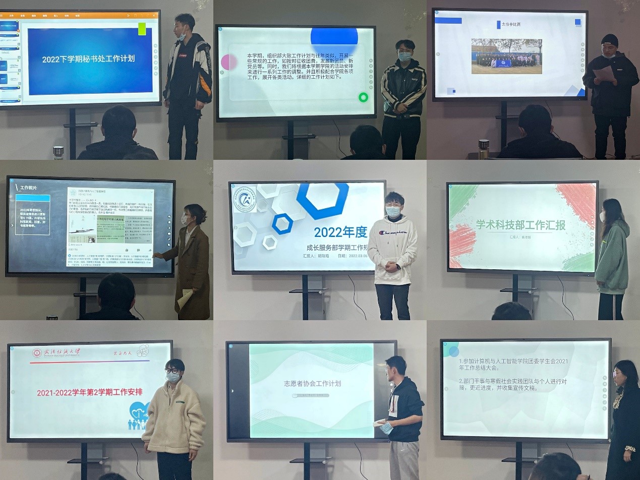 i心苑部长裴进重点结合本学期的3·25大学生心理文化节和5·25心理健康日将要开展的主题活动进行了较为具体的规划安排,以保证活动达到向同学传递良好的心理健康理念、鼓励同学积极关注自身心理健康的预期效果;志愿者协会部长李进宇强调本学期将在校内外结合线上线下多种方式开展更加贴合计算机专业特色的主题志愿服务活动,并联合媒体运营部加强志愿活动的宣传工作,提高学院影响力;学习实践部部长靳然提到新学期会严格日常查课制度,同时将根据实际需要开展各类新工作协助学院加强学风建设。