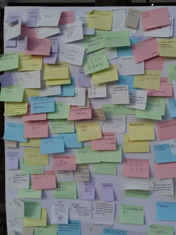 在活动现场,同学们可以将自己心中想要对父母、亲人或是身边同学、朋友表达的感恩之情通过现场领取的便利贴用文字书写出来,亦或是对曾经帮助过自己的人表达出感谢之情或寄予美好的祝愿。