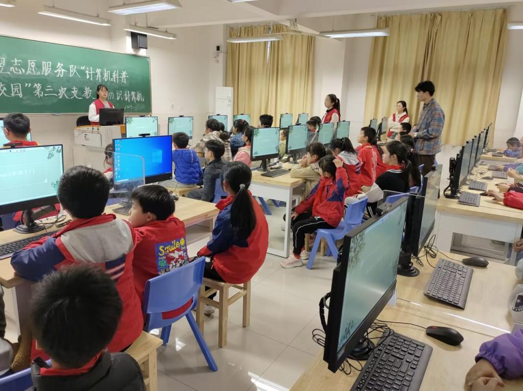 对于一至二年级的小朋友,服务队的教学更侧重于基础知识的了解与应用,课前在复习上节课的内容时,小朋友们都能够快速且准确地答出知识要点。播放生动有趣的小短片时,小朋友们聚精会神地聆听着计算机的发展史,了解那些他们从未听说过的知识,为心田里的计算机种子撒下露珠。对于稍微深奥一点的内容,志愿者哥哥姐姐们都会及时关注并给小朋友解疑答惑。