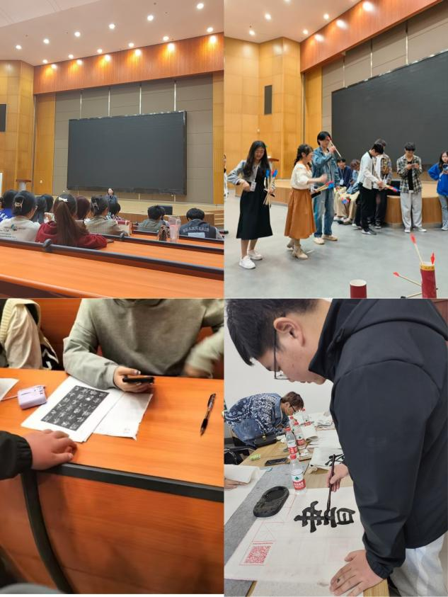 交流会活动中,各高校书协代表介绍了各自书画社团的日常活动及其训练,彼此增进了解。之后大家进行了投壶、猜字画等小游戏,迅速活跃了现场气氛。最后跟随武汉学院的引导来到教室,各书协成员自由交流书画心得,并由武汉学院墨耘书法协会、湖北中医药大学书画协会、ok138cn太阳集团书画协会、武汉生物工程学院晨光书画协会合作完成一副作品。