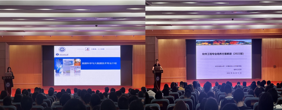 院长胡新荣致开场辞,向2022级全体本科生表达了亲切的慰问,同时强调,本科阶段学的是思维、是基础知识,目前学院现有的专业都很好且各具特色,同学们要结合自身特长、爱好进行理性选择。她指出,没有不好的专业、只有不够努力的人,选择一个专业后,未来更多的取决于自身的努力,而不是所谓的专业“红利”或“光环”。她勉励同学们要发扬“学至于行,笃行于新”的院训,把握计算机与人工智能发展的时代风口,奋发有为、不负青春。