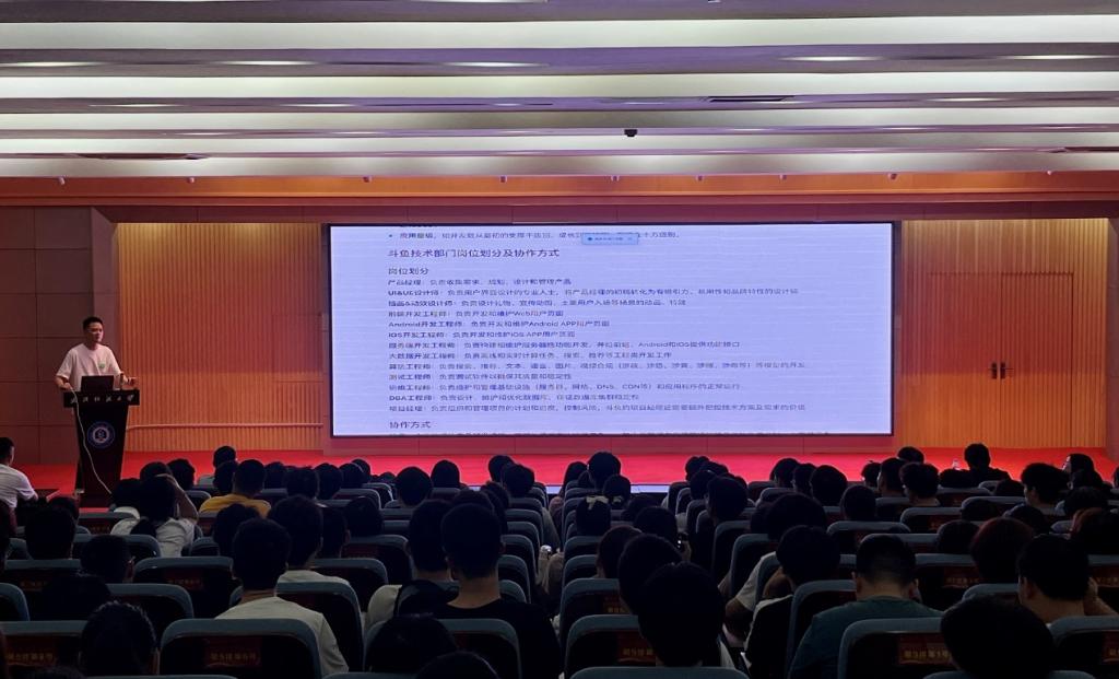 在进行专业分流教育之前,校友张泽清为同学们做计算机行业发展和职业规划的报告,从行业技术发展趋势、企业技术需求、用人标准等角度,为学生学业规划和职业规划提供指导。