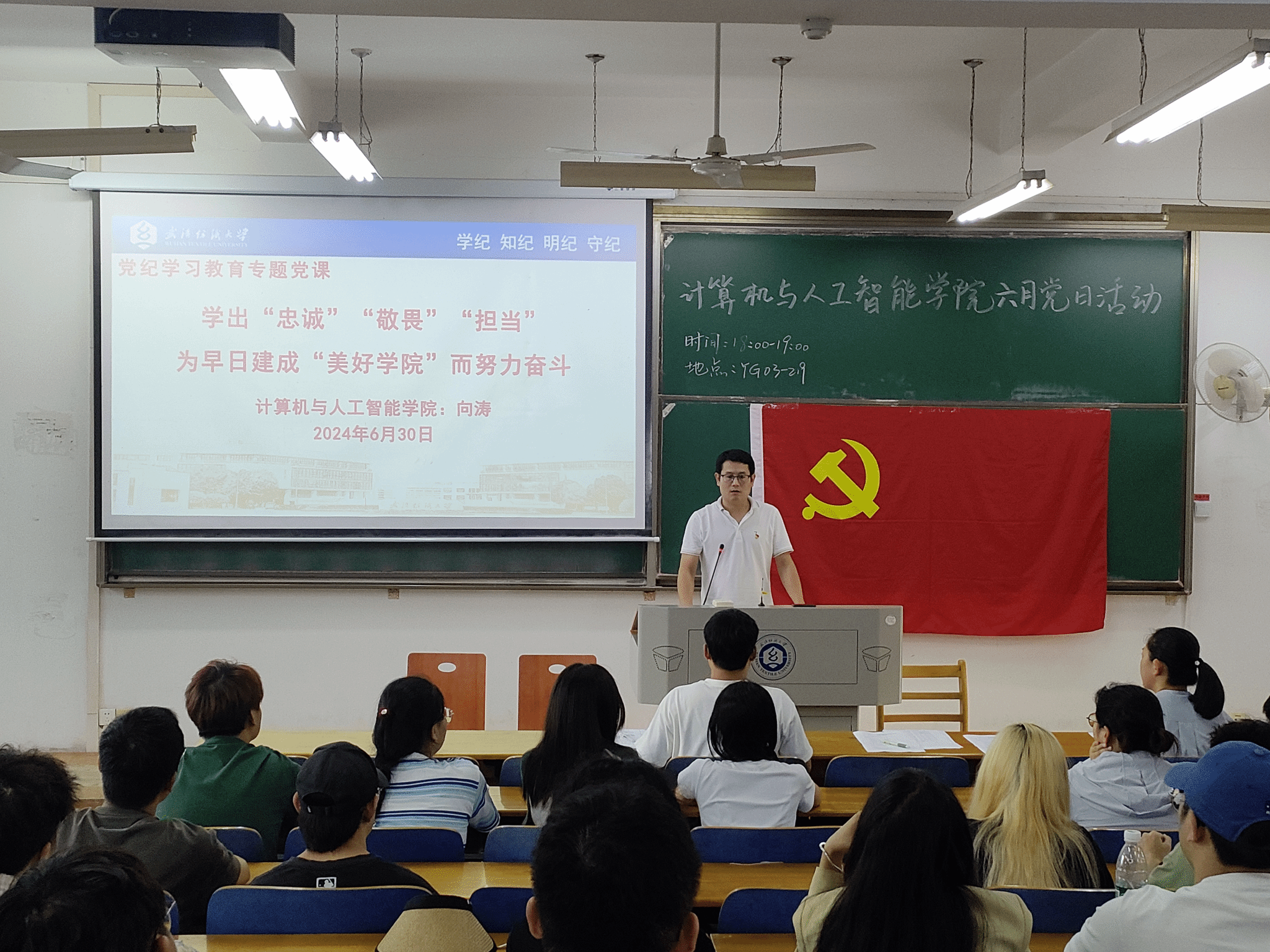 为深入学习贯彻习近平总书记关于党纪学习教育的重要讲话和重要指示精神,引导学生党员学纪、知纪、明纪、守纪,6月30日下午,ok138cn太阳集团529学生党支部于3号教学楼219教室开展党纪学习教育专题党课活动。会议由本科生第一党支部书记张栋主持,学院党委副书记向涛,辅导员廖龙、喻仪、余梦帆,全体学生党员共同参加。