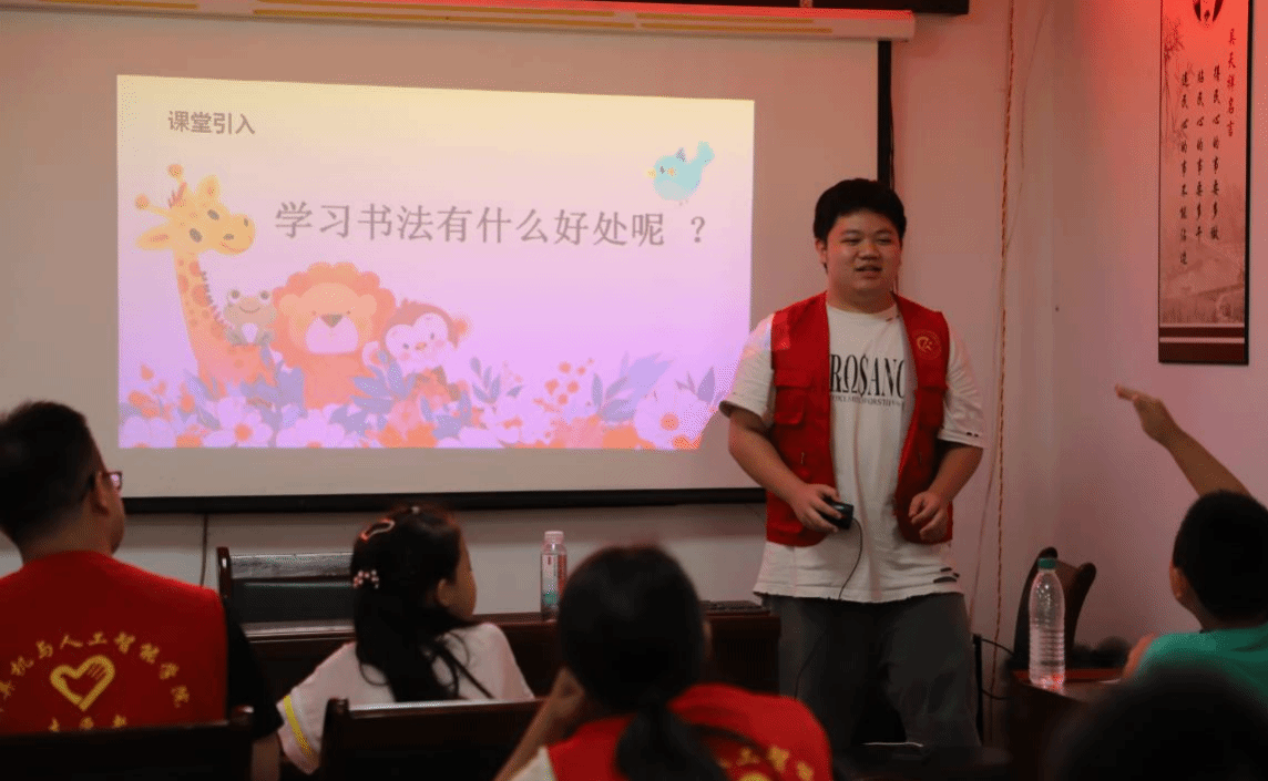 实践团成员们充当起了书法导师的角色,用流畅的笔触和耐心的示范,引导孩子们探索汉字的艺术魅力。他们从最基本的点、撇、捺开始,从坐姿的正确与否开始,一步步耐心地教授孩子们书法的基本技巧。比如,在教授“点”的时候,志愿者们会手把手地教孩子们如何控制笔力,使每一“点”都显得饱满有力。随着时间的推移,孩子们在实践团成员的指导下,开始尝试书写简单的诗歌。他们专注地描绘每一个字,从笔画的起承转合中,孩子们不仅学会了书法的技巧,更感受到了传统文化的魅力。