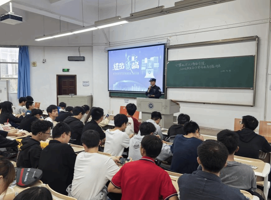 邓警官强调诈骗分子不再局限于传统的电话诈骗和邮件诈骗,而是利用社交媒体、在线支付平台等新渠道实施诈骗。他们冒充政府机构、银行工作人员、亲友等,以获取个人信息和资金。宣讲会上,邓警官详细介绍了网络诈骗的常见手段、案例以及防范方法。邓警官通过生动的实例,深入浅出地解析了网络诈骗的陷阱,强调了个人信息保护的重要性,并提供了一些实用的防范技巧。同时,邓警官从同学们身边的小事入手,以大学生活中常见的情况为切入点,切身实地的向同学们讲解了诈骗分子的手段,有利于同学们更好的做好个人防范,提高反诈意识。