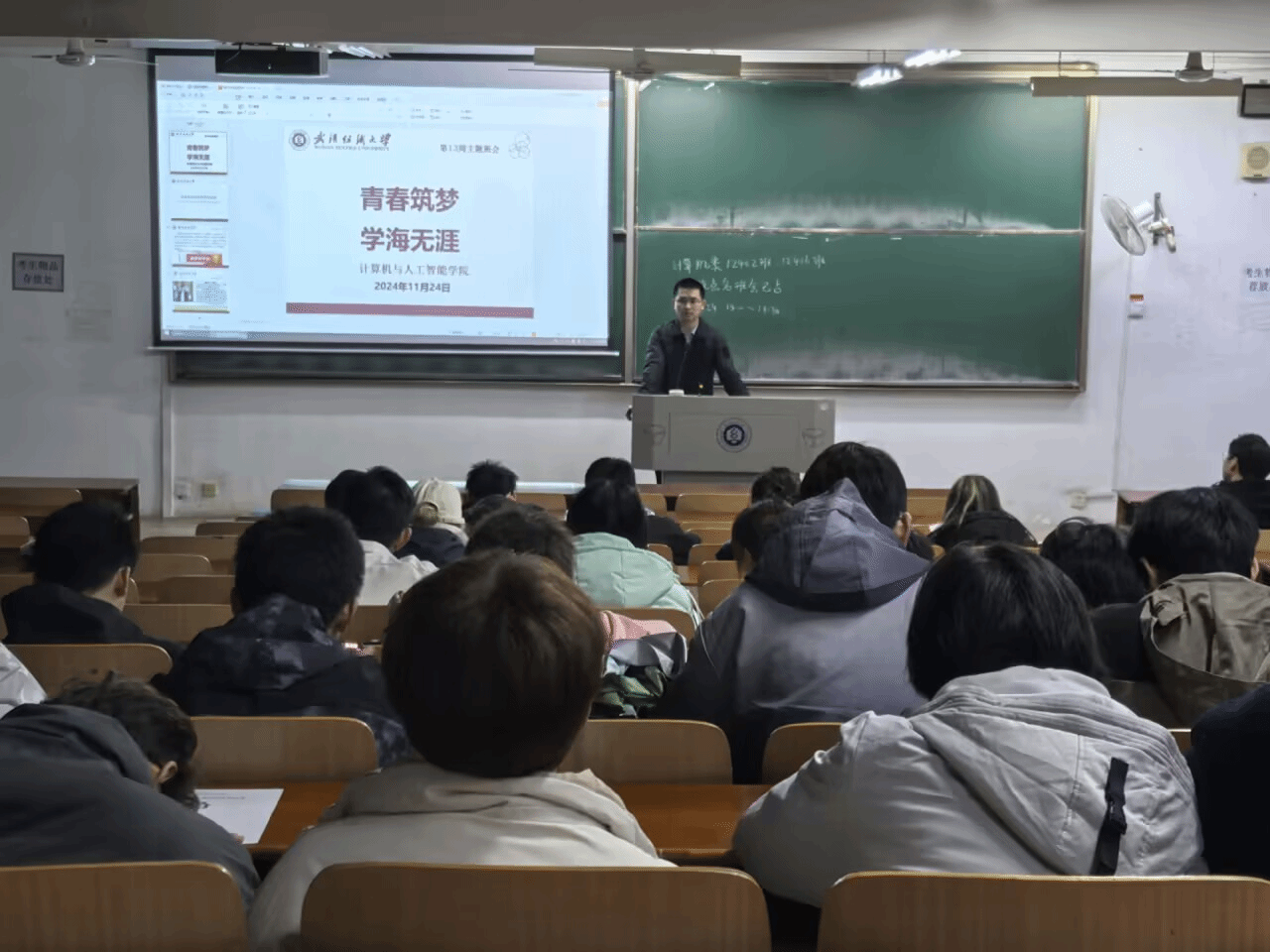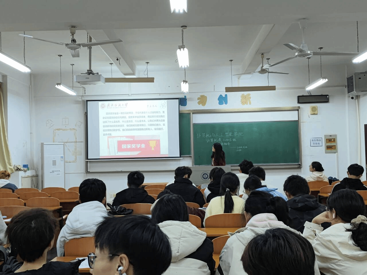 班会开始,各班级班长清点到会人数,确认学生的在校情况。随后班主任从对国家奖学金的讲解开始,让大家对国家奖学金有更清晰的认识,随后用优秀学长学姐的事例向同学们科普想要获得国家奖学金应该做好什么准备,激发同学们的学习热情。