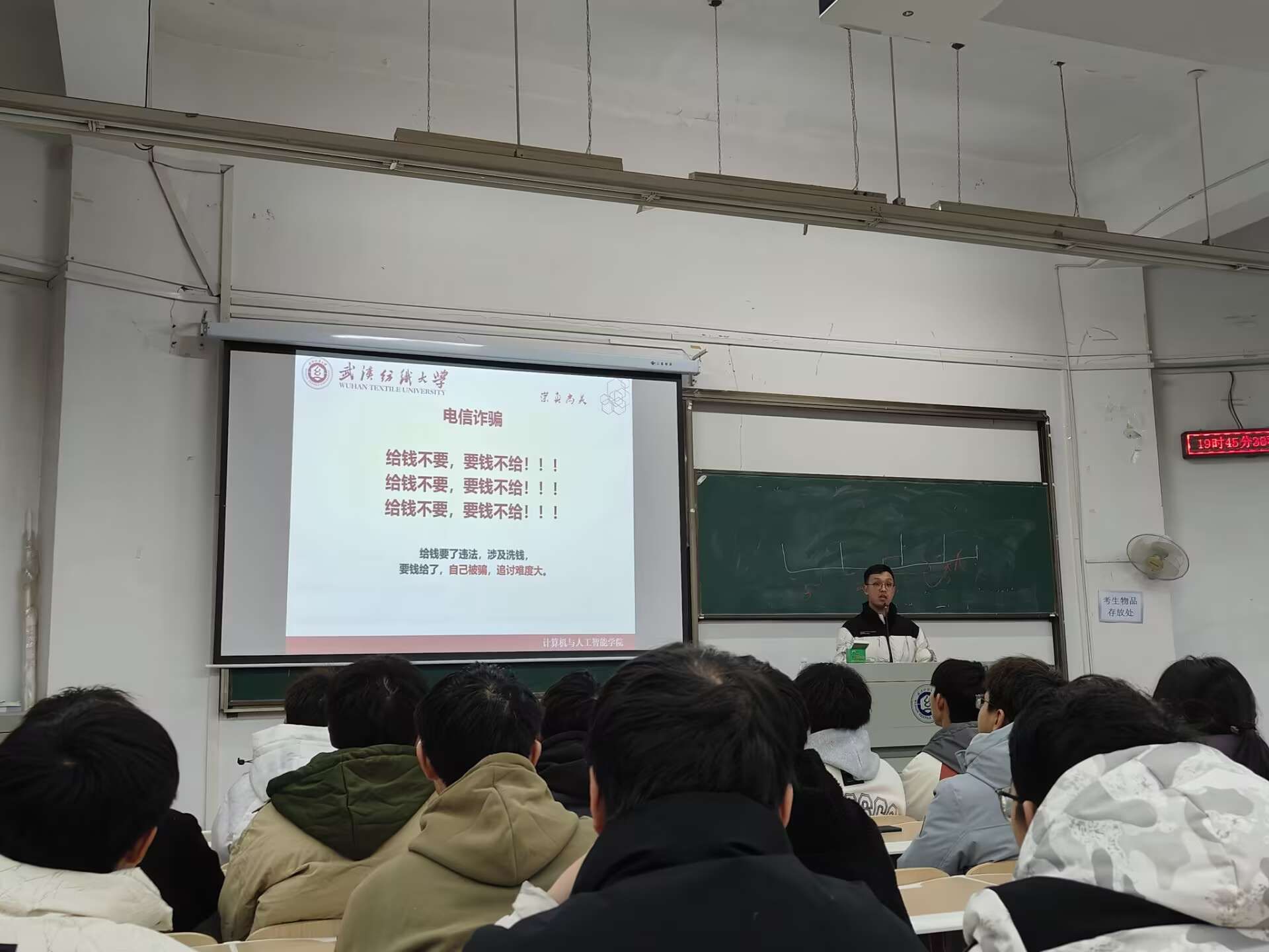 随后,辅导员强调了如何防范电信诈骗,涉及陌生电话或信息的金钱交易牢记:不听、不信、不转账,三不原则;涉及熟人借钱等诈骗方式铭记:要钱不给,给钱不要,不“轻敌”,做好防范,保护好钱包,守护校园钱财安全的蓝天白云。