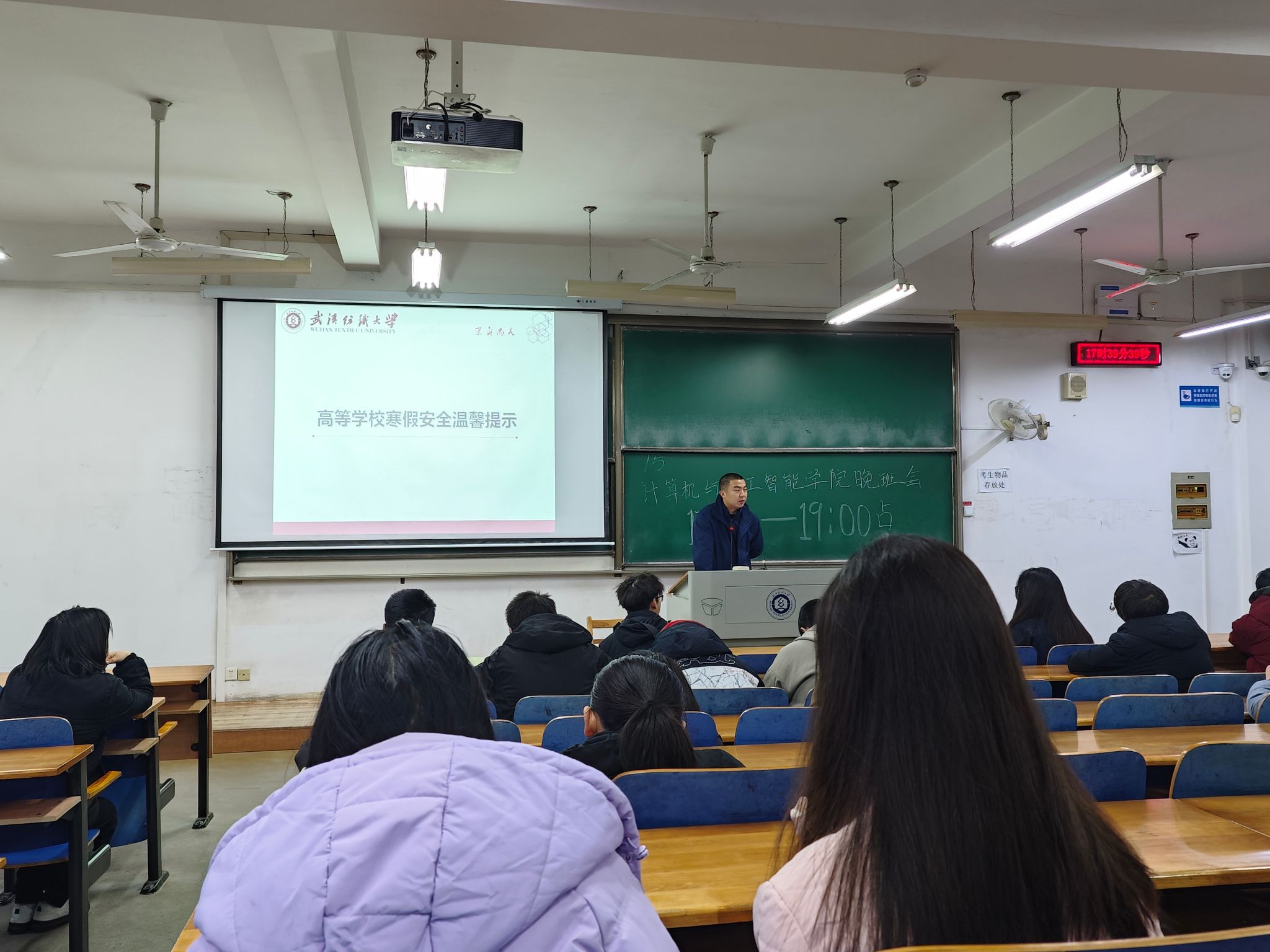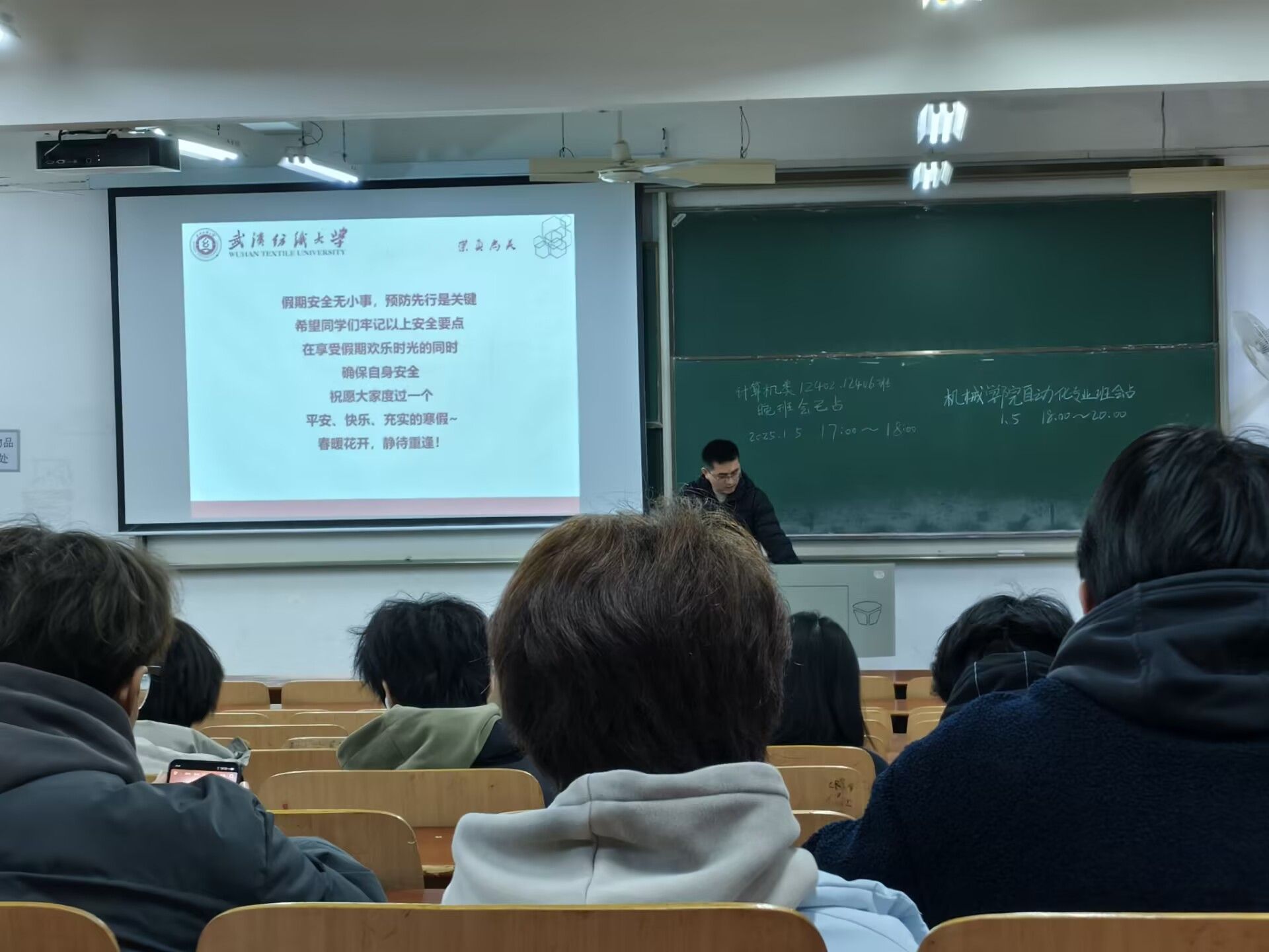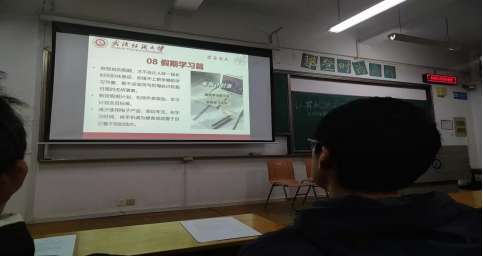 班会开始前,由班长进行晚点名确认学生的报道情况,并向辅导员说明未报到学生的名单及事由。随后由辅导员向大家通知放假消息以及展示湖北省教育厅发布的《高等学校寒假安全温馨提示》。