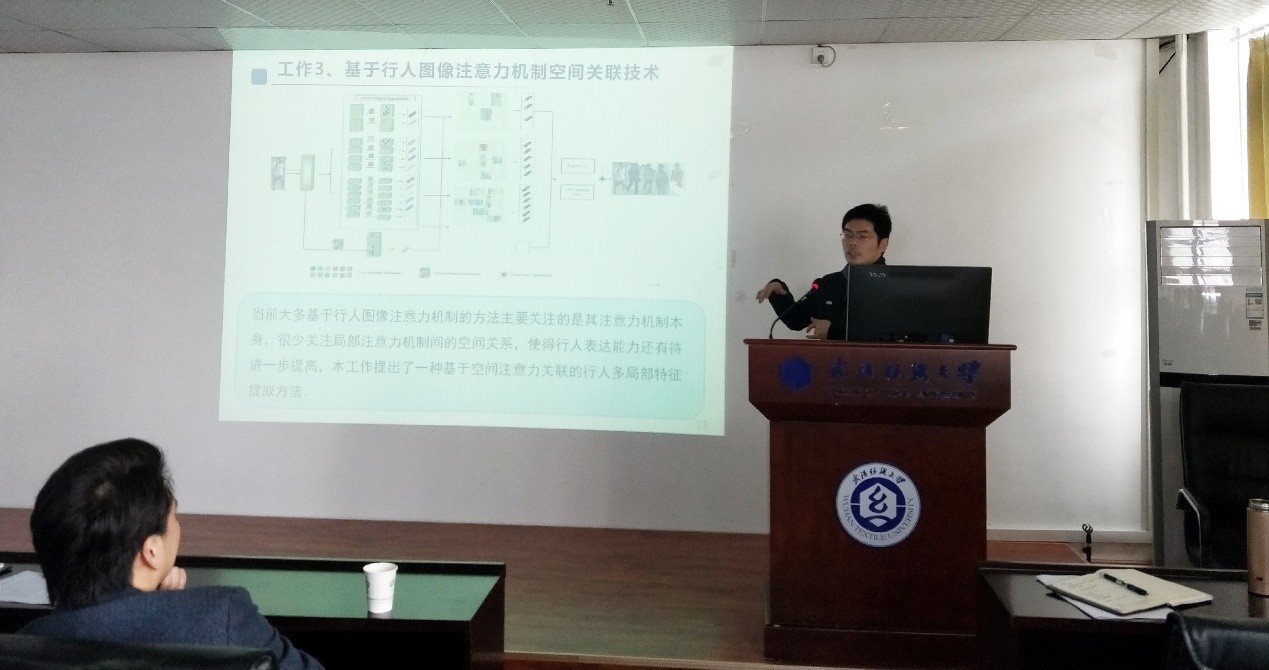 熊明福博士报告的题目为《时尚个体属性迁移的行人重识别》,主要介绍了基于时尚个体属性的行人重识别关键技术研究的课题研究。他简要论述了行人重识别的研究背景、研究现状、研究的创新点及未来研究方向。他指出,行人重识别技术作为常用的监控视觉局限的技术性弥补,可与行人检测技术相结合,应用于智能监控领域。他的报告条例清晰,观点新颖,引起了师生浓厚的兴趣。
