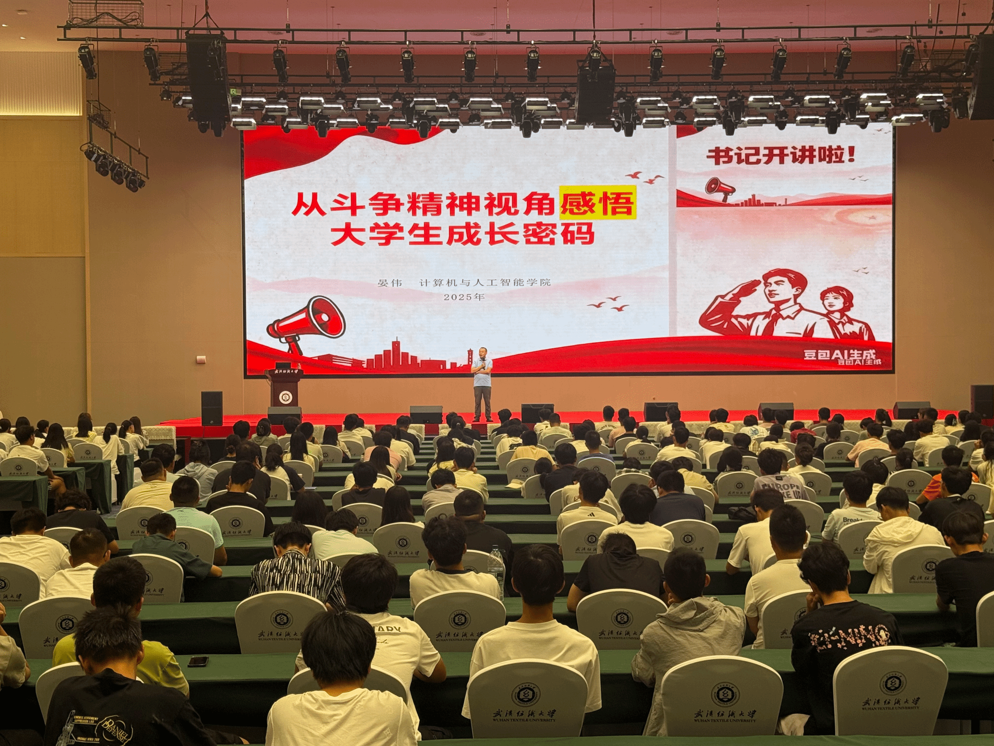 三是要以党的破局智慧为钥,敢创新求突破,“勇于突破”激活大学生“成长潜能”。他以红军陕北会师以来成长壮大中的破局智慧为例,突出“勇于突破”是打破“成长天花板”、激活自身潜能的关键,是应对风险挑战、开创发展新局的核心能力。他希望同学们立场坚定、自力更生、积少成多,强调创新是计算机与人工智能领域的灵魂,呼吁同学们要打破“应试思维”和“路径依赖”,在课程学习、项目开发和学科竞赛中敢于提出新想法、探索新路径,将“创新潜能”转化为实实在在的“破局成果”。