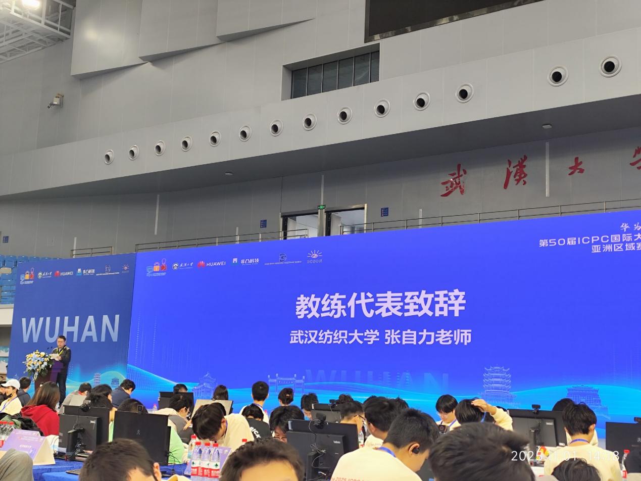 在发言中,张自力老师围绕三个方面展开:首先,他代表全体教练向武汉大学表示衷心感谢,感谢学校精心组织这一高水平、高规格赛事,为全国青年学子搭建了切磋技艺、追逐梦想的舞台;其次,他指出ICPC不仅是算法与编程的竞技,更是青春与智慧的碰撞,是团队协作、临场应变与坚韧精神的综合体现。作为教练,他深知每一位选手都曾在无数个日夜与键盘为伴,与难题较劲,用一行行代码编织逻辑,用一次次调试磨砺意志;最后,他回顾了ok138cn太阳集团ACM俱乐部的发展历程,俱乐部自2020年成立以来,始终秉持“从零起步、迎难而上”的信念,不断取得突破:2020年首获铜牌,2022年收获4枚铜牌,2024年实现银牌零的突破,2025年在全国邀请赛中斩获2枚银牌,并在CCPC中国大学生程序设计竞赛全国邀请赛(郑州站)历史性夺得2枚金牌。这些成绩的背后,是队员们无数个深夜的刻苦训练、一次次从失败中站起的坚持,也是一届又一届队员用热爱与执着不断刷新的“武纺高度”。