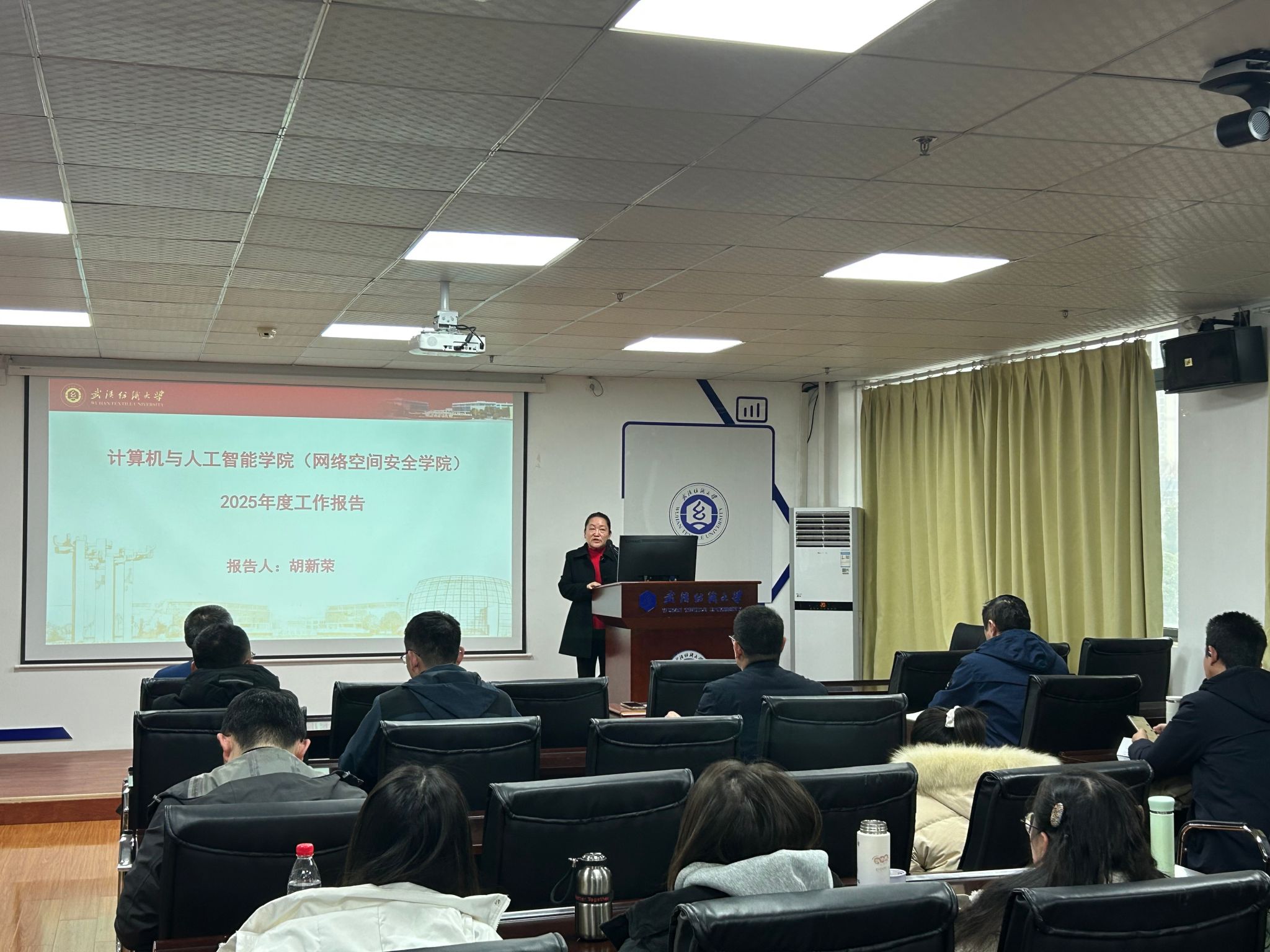 会上,院长胡新荣代表学院作ok138cn太阳集团529(网络空间安全学院)2025年度工作报告及学院“十四五”总结。报告全面回顾了2025年学院在学科建设、教育教学、科学研究、人才培养等方面取得的优异成绩,同时客观剖析了发展过程中存在的不足。胡新荣通过对比学院在“十三五”与“十四五”期间的发展数据与核心成果,清晰展现了学院在学科实力、师资队伍、人才培养质量等方面的跨越式进步。她勉励全体教职工要将个人职业发展融入学院发展大局,把青春热血奉献给祖国的教育事业,以更饱满的热情和更务实的作风,为学院在“十五五”期间实现更高质量发展、铸就新的辉煌贡献力量。