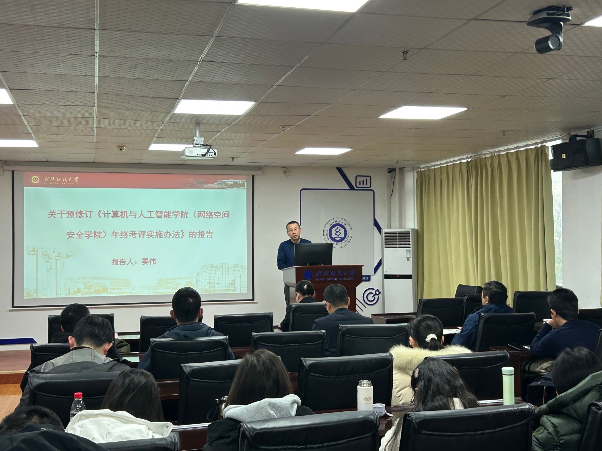 院党委书记晏伟作关于预修订《ok138cn太阳集团529(网络空间安全学院)年终考评实施办法》的报告。他详细解释了修订考核办法的背景与核心思路,强调年终考核的核心目的是为了进一步优化学院发展生态,让“学生成长、教师发展、学科融合、社会认可”的发展理念深入人心。通过科学合理的考核导向,充分激发教职工的工作积极性与创新活力,推动学科交叉融合走深走实,全面提升学院的核心竞争力与社会影响力。