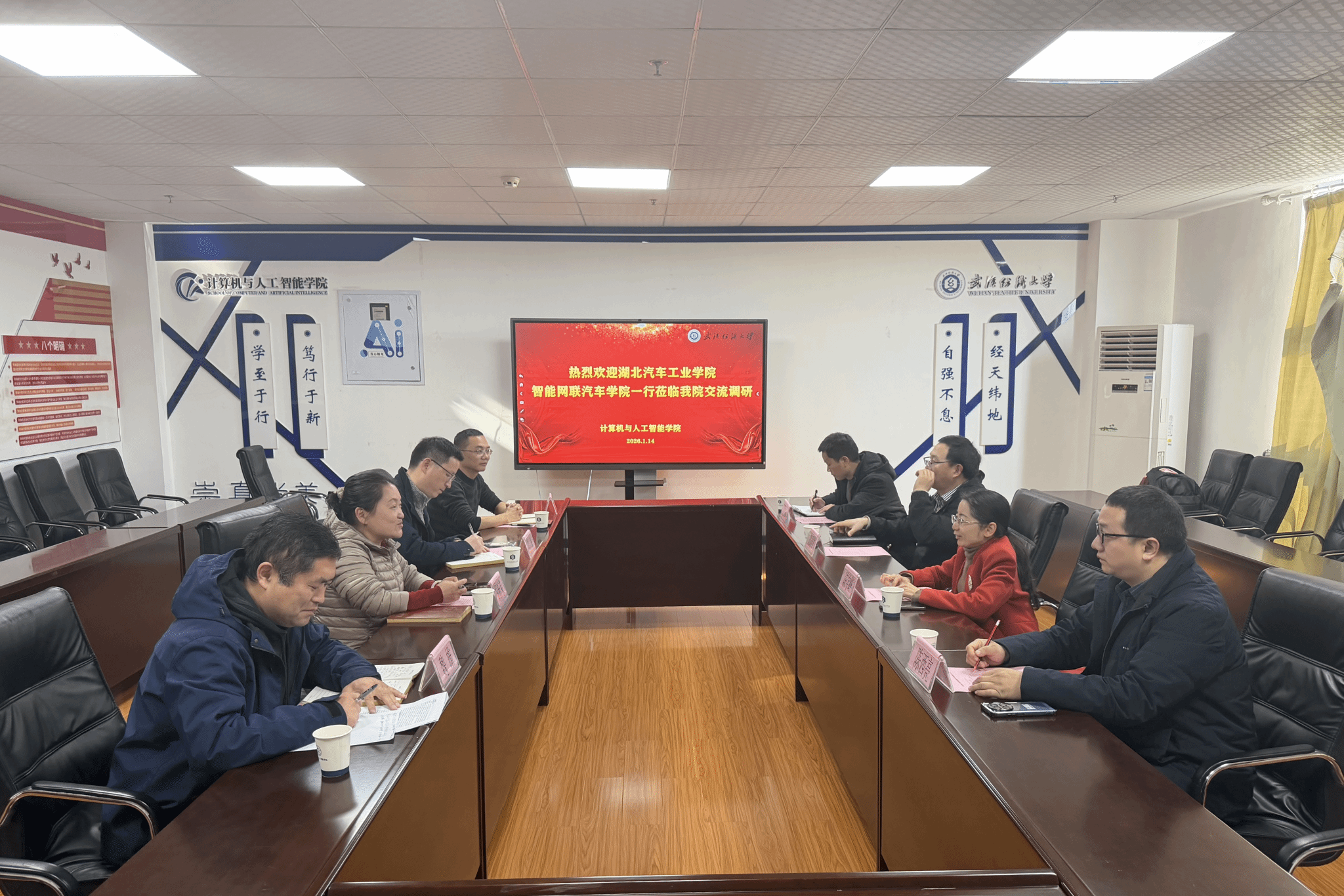 1月14日上午,湖北汽车工业学院智能网联汽车学院院长陈宇峰一行莅临我院进行参观交流。院长胡新荣等院领导热情接待了来访嘉宾,双方在学院会议室举行交流洽谈会。