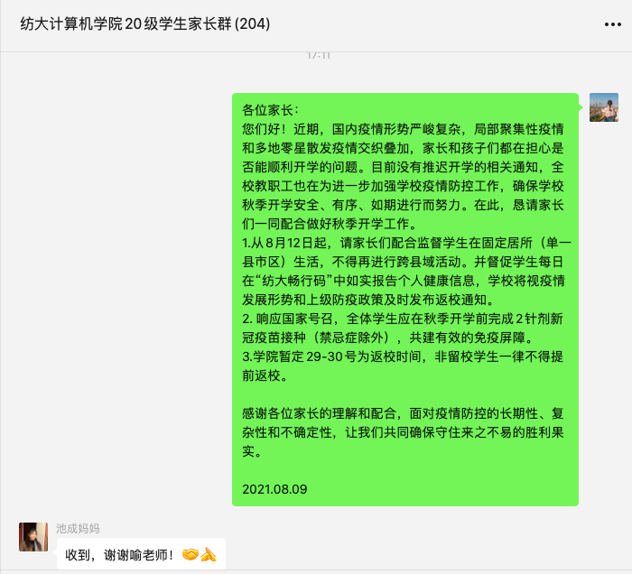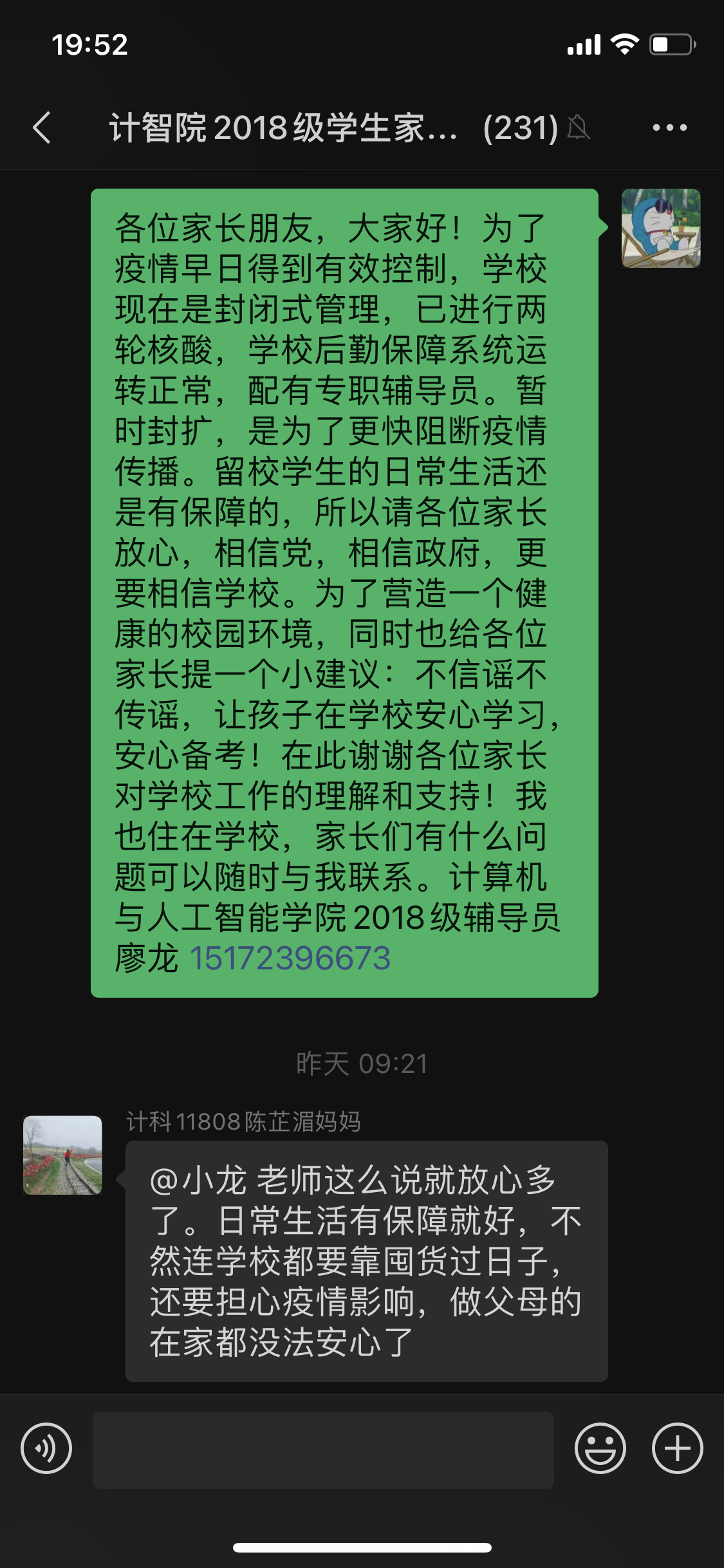 学院通过开家长会、短信、电话、微信等方式,积极与留校学生的家长们取得联系,方便家长们及时了解孩子在学校封控管理期间的生活情况,避免家长过度担心自己孩子的人身安全,并就家长们提出的疑问,积极作出回复,消除家长们的顾虑。同时也请各位家长放心,学院会根据学校的具体工作安排,积极调配相关的生活物资,及时响应学生们生活学习上的诉求,为留校学生的日常生活提供强有力的保障。